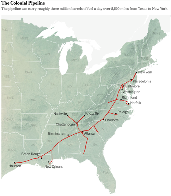 受到這一事件的影響,美國東海岸局部地區用油陷入短時間危機。根據公開資料顯示,Colonial Pipeline是美國最大的成品油輸油管道之一,通過長達5500英里的管道,平均每日從休斯頓向紐約輸送約300萬桶成品油,服務地區覆蓋大多數美國東南部州,并一直延展至大西洋岸和田納西州。