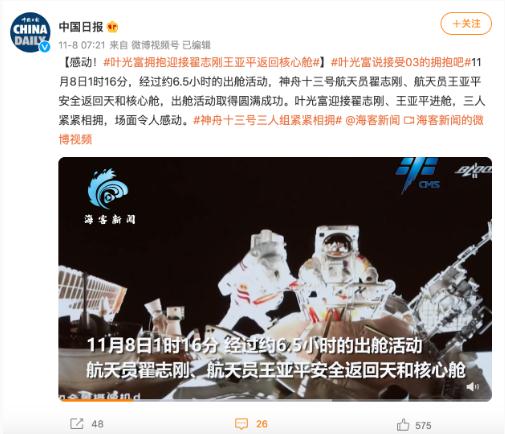 據中國載人航天工程辦公室消息,北京時間 2021 年 11 月 8 日 1 時 16 分,經過約 6.5 小時的出艙活動,神舟十三號航天員乘組密切協同,圓滿完成出艙活動全部既定任務,航天員翟志剛、航天員王亞平安全返回天和核心艙,出艙活動取得圓滿成功。