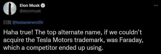 馬斯克在評(píng)論中表示,如果當(dāng)時(shí)無(wú)法獲得特斯拉汽車商標(biāo),那可能就要叫“法拉第”了,不過(guò)那個(gè)名字已經(jīng)被競(jìng)爭(zhēng)對(duì)手用了。