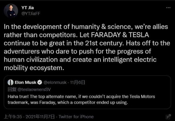 賈躍亭在推特上回應(yīng)馬斯克的這一評(píng)論: