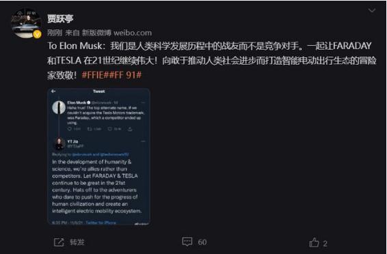 ▼ 賈躍亭也將這一回應(yīng)發(fā)布到了微博,不過(guò)馬斯克在兩個(gè)平臺(tái)都沒(méi)有回復(fù)他